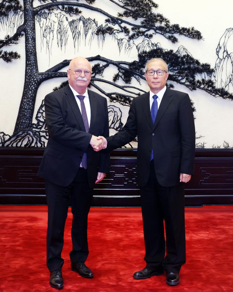 Li Hongzhong, a member of the Political Bureau of the Communist Party of China Central Committee and vice chairman of the National People's Congress Standing Committee, meets with a delegation from the France-China Friendship Group of the French Senate led by Claude Raynal, the group's honorary president, in Beijing, capital of China, Sept. 26, 2025. (Xinhua/Liu Weibing)