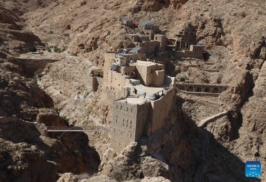 This photo taken on Sept. 22, 2025 shows a panoramic view of Deir Mar Musa al-Habashi, an ancient Syriac Catholic monastery, in the Qalamoun mountains, north of Damascus, Syria. (Photo by Ammar Safarjalani/Xinhua)