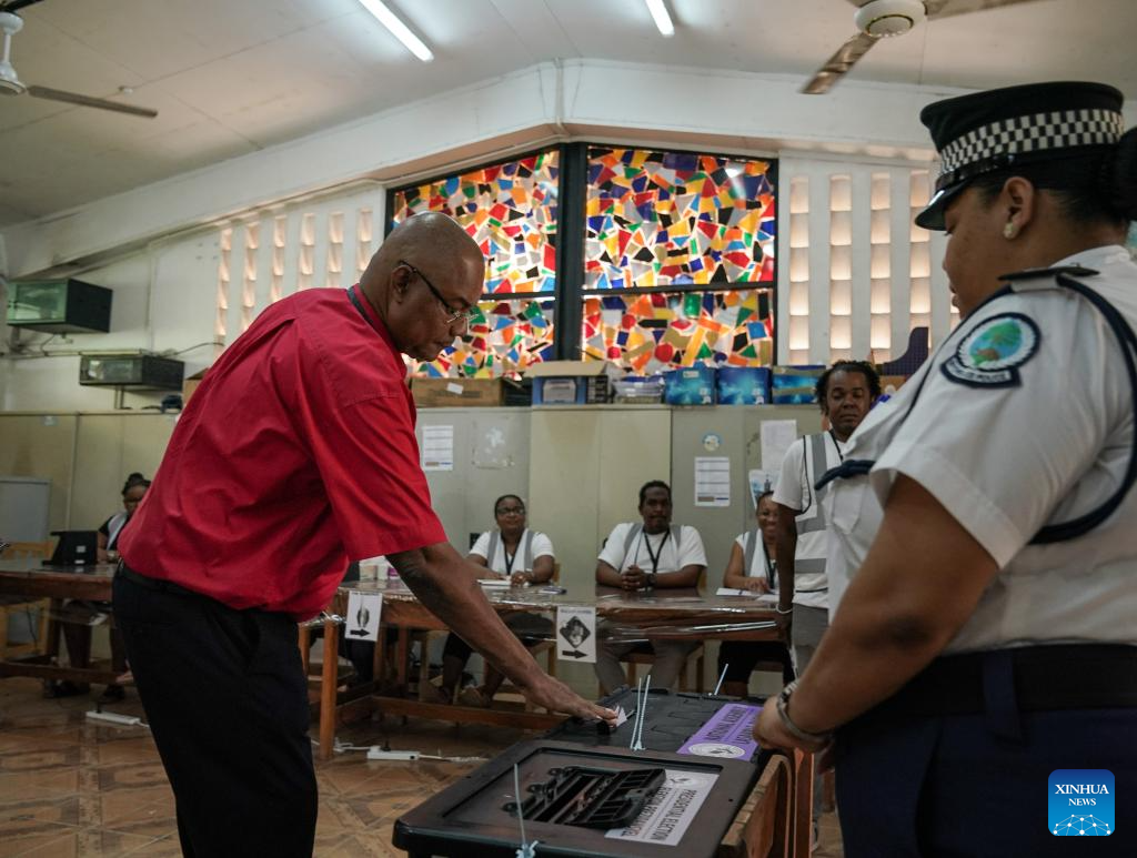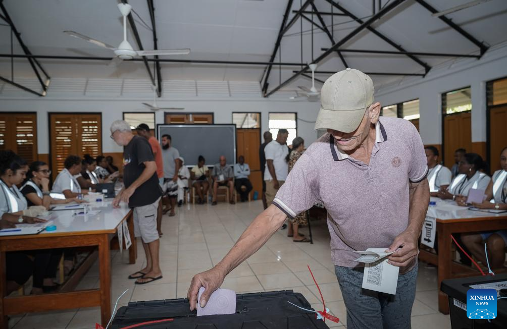 A voter casts his vote at a polling station in Victoria, Seychelles, on Sept. 27, 2025. Over 77,000 voters in Seychelles began casting their ballots on Thursday in an election that will run through Saturday to choose both the president and members of the National Assembly.