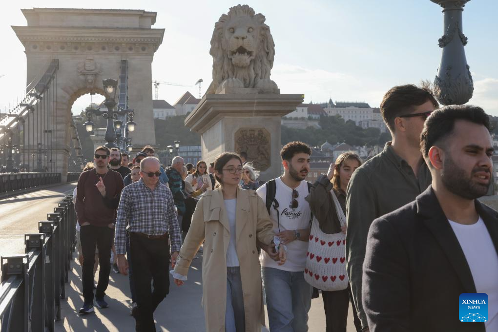 Tourists walk across the Chain Bridge in Budapest, Hungary, on Sept. 27, 2025. Hungary's tourism hit a 2025 peak in August with 2.8 million visitors, up 5.2 percent year-on-year, driven mainly by a 10 percent surge in foreign arrivals, according to the Ministry for National Economy. (Photo by Attila Volgyi/Xinhua)