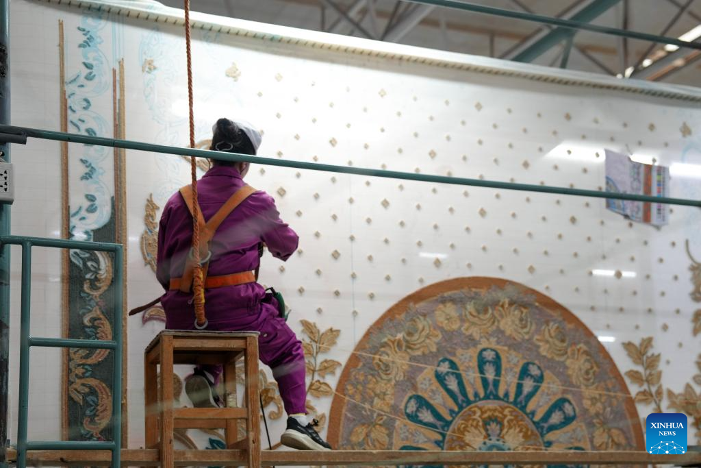 An employee works on a Tibetan carpet at a workshop of Shengyuan carpet group in Xining, northwest China's Qinghai Province, Sept. 27, 2025. Tibetan carpet is a traditional handicraft on the Qinghai-Tibetan Plateau with a history of more than 1,000 years. The carpets are essential items for the nomadic people on the plateau to withstand the cold. The fine yak and sheep wool and the delicate weaving skills and patterns made the handmade products popular among overseas and domestic customers.
