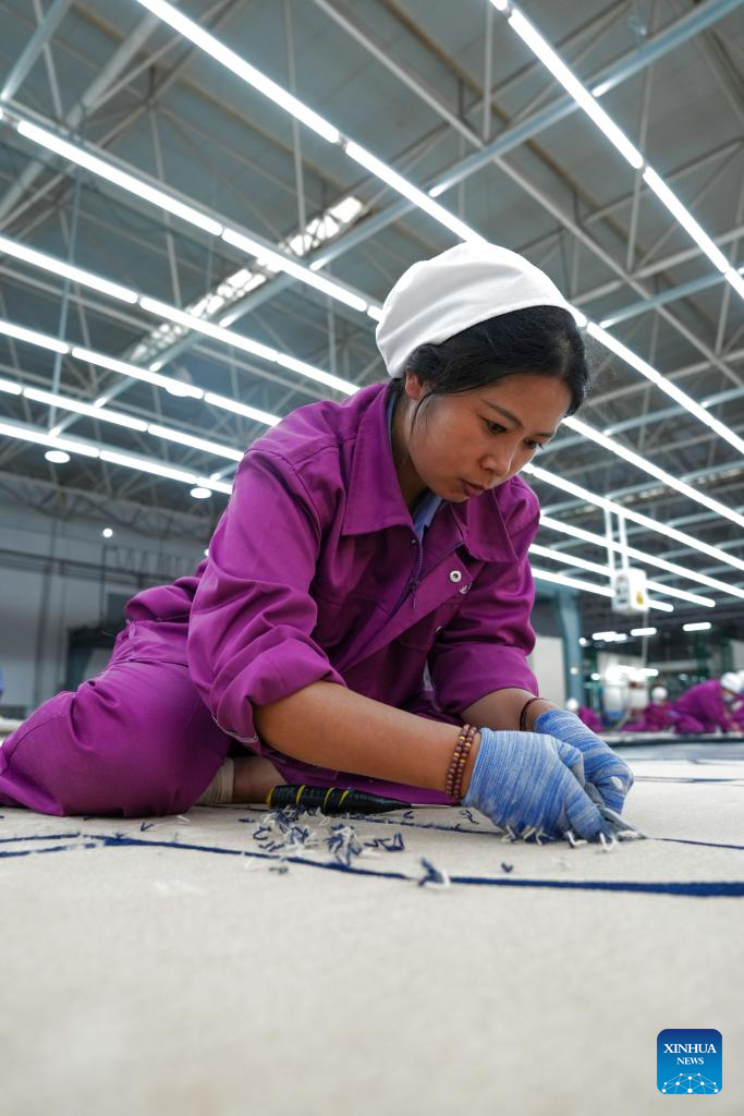 An employee works at a workshop making Tibetan carpets in Shengyuan carpet group in Xining, northwest China's Qinghai Province, Sept. 27, 2025. Tibetan carpet is a traditional handicraft on the Qinghai-Tibetan Plateau with a history of more than 1,000 years. The carpets are essential items for the nomadic people on the plateau to withstand the cold. The fine yak and sheep wool and the delicate weaving skills and patterns made the handmade products popular among overseas and domestic customers.