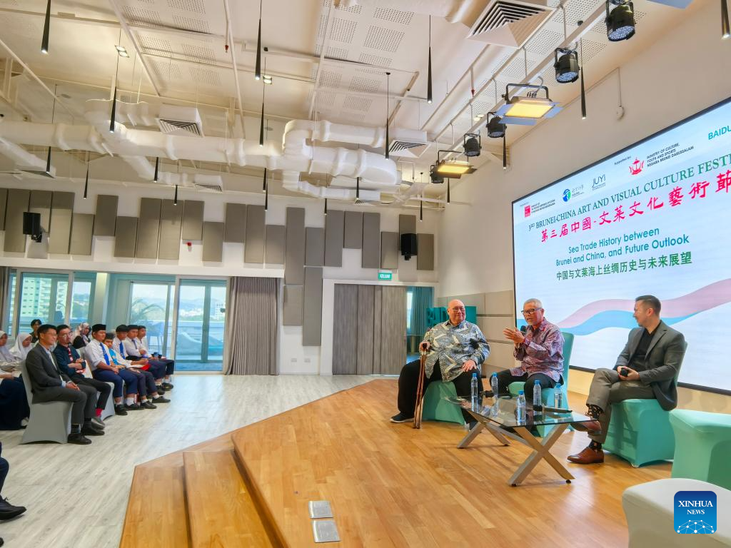 Guests have a discussion during the Brunei-China Art and Visual Culture Festival 2025 held near Bandar Seri Begawan, Brunei, on Sept. 27, 2025.