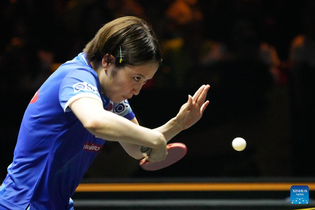 Hirano Miu of Japan hits a return during the women's singles round of 64 match between Sun Yingsha of China and Hirano Miu of Japan at 2025 World Table Tennis (WTT) China Smash in Beijing, China, Sept. 28, 2025. (Xinhua/Xie Han)