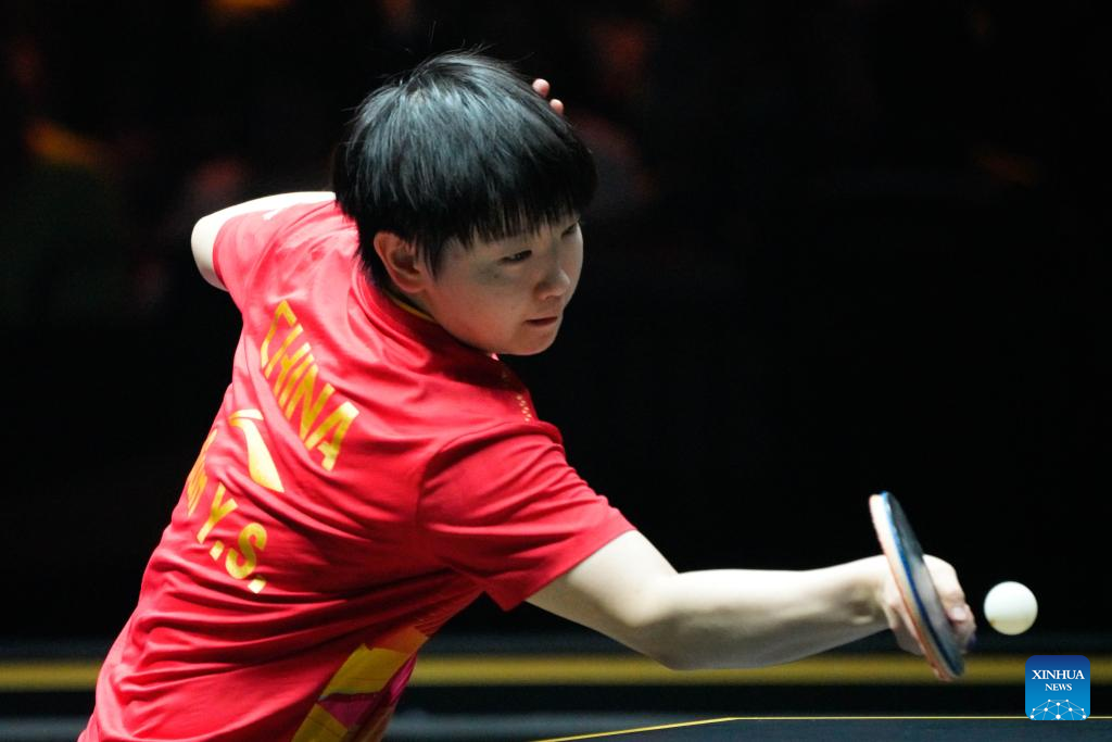 Sun Yingsha of China hits a return during the women's singles round of 64 match between Sun Yingsha of China and Hirano Miu of Japan at 2025 World Table Tennis (WTT) China Smash in Beijing, China, Sept. 28, 2025. (Xinhua/Xie Han)