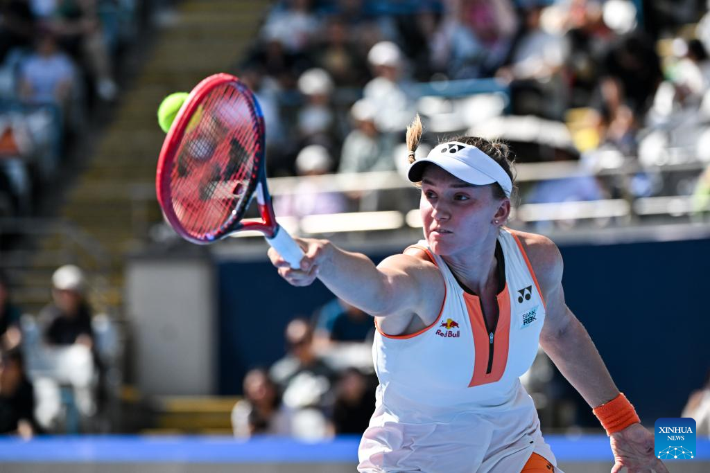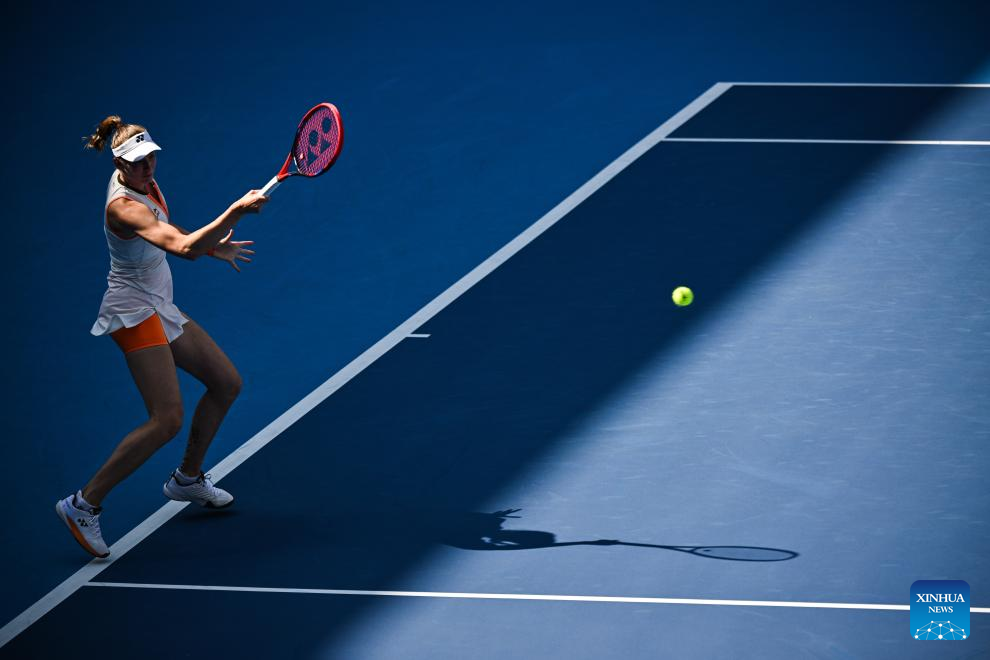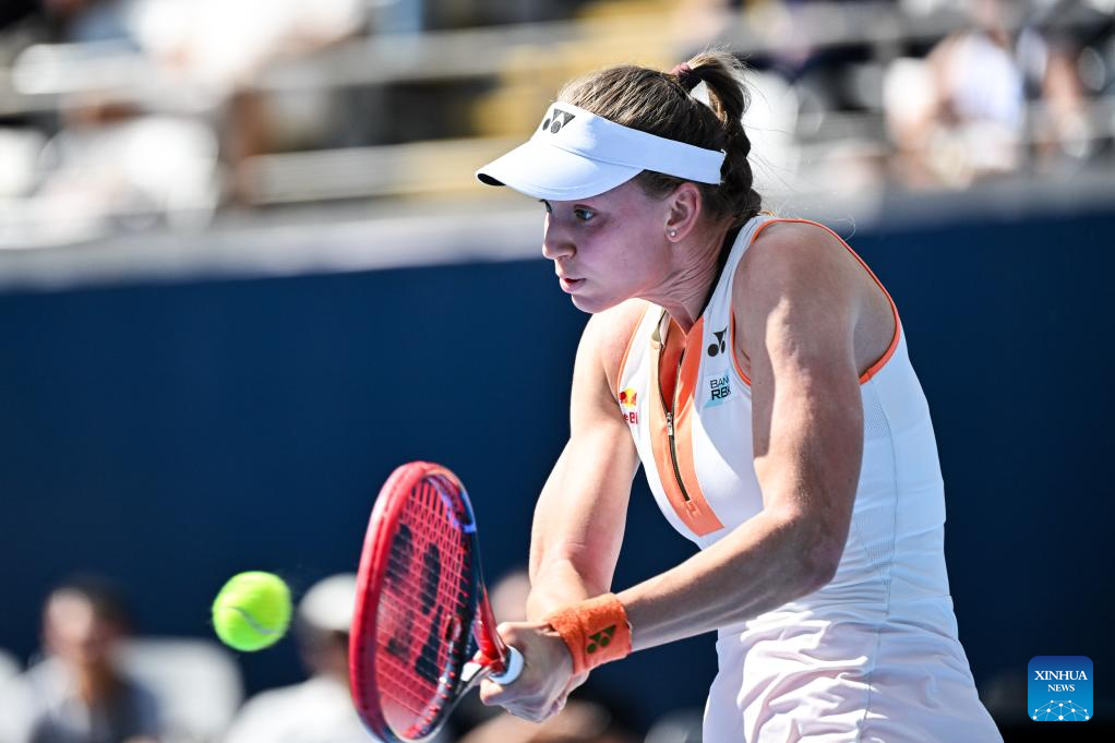 Elena Rybakina of Kazakhstan hits a return during the women's singles third round match between Elena Rybakina of Kazakhstan and Eva Lys of Germany at 2025 China Open tennis tournament in Beijing, China, Sept. 28, 2025. (Xinhua/Xin Mengchen)