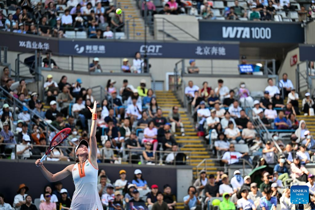 Elena Rybakina of Kazakhstan serves during the women's singles third round match between Elena Rybakina of Kazakhstan and Eva Lys of Germany at 2025 China Open tennis tournament in Beijing, China, Sept. 28, 2025. (Xinhua/Xin Mengchen)