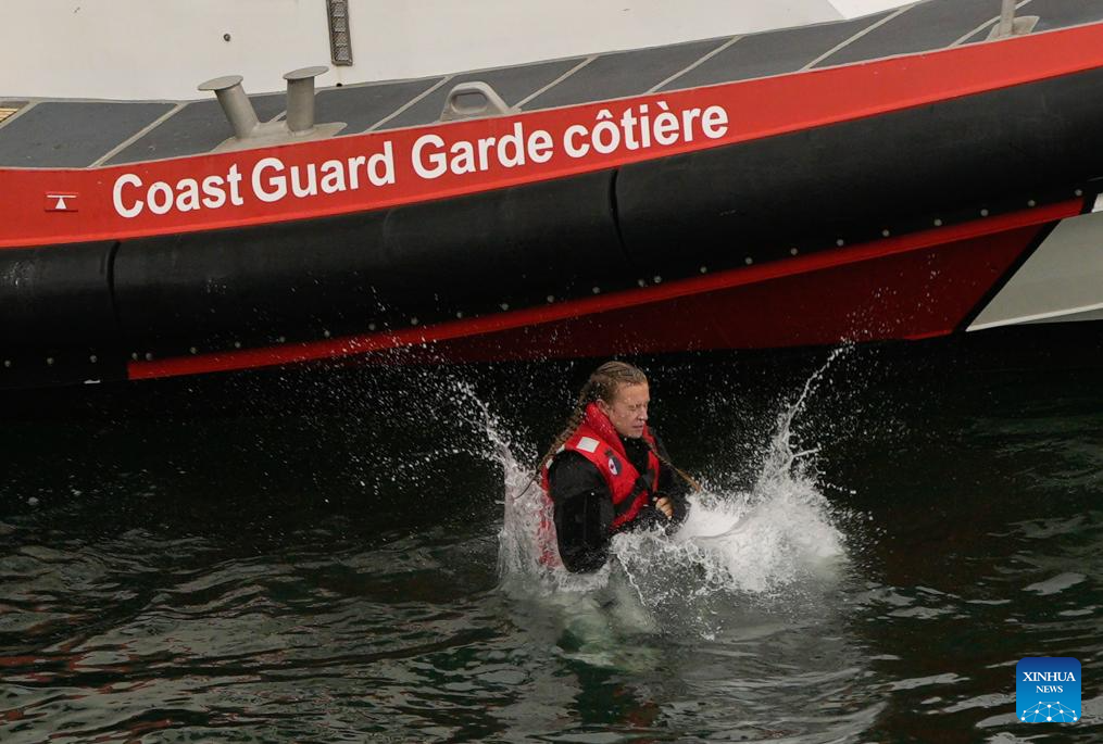 A Canadian Coast Guard member jumps into the water during a rescue demonstration off Canada Place at Port Day in Vancouver, British Columbia, Canada, Sept. 27, 2025.