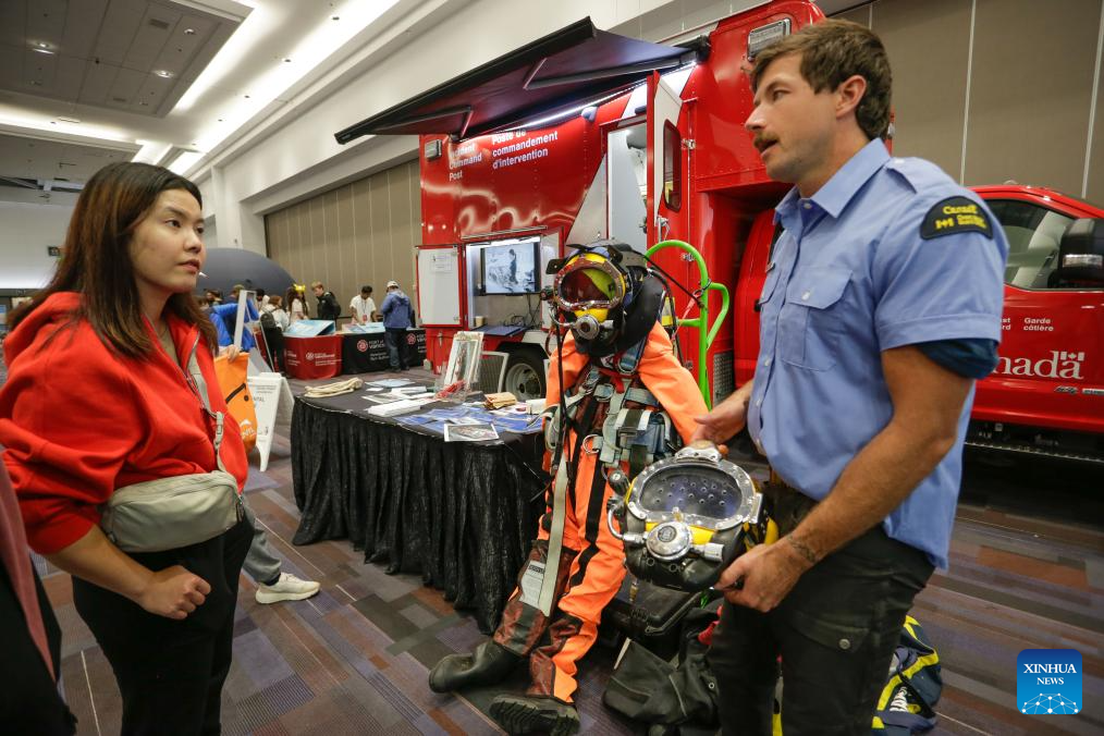 A Canadian Coast Guard member showcases diving equipment during Port Day in Vancouver, British Columbia, Canada, Sept. 27, 2025.