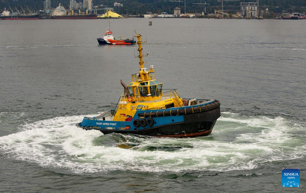 A Vancouver harbour tug vessel performs high-speed turns during a marine demonstration off Canada Place at Port Day in Vancouver, British Columbia, Canada, Sept. 27, 2025.