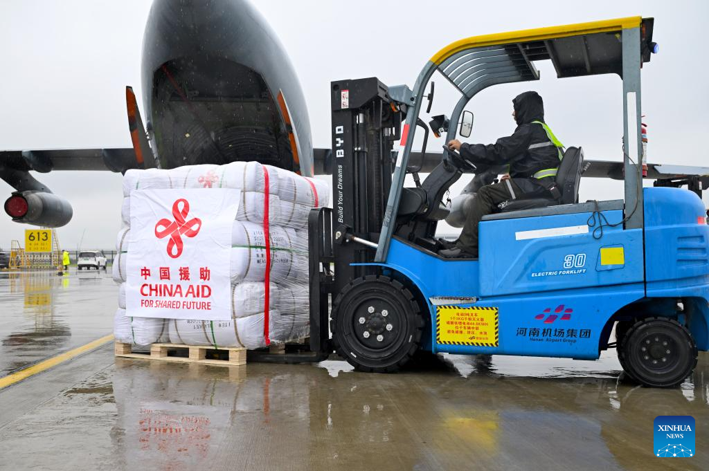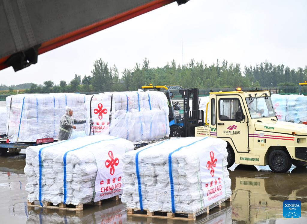 Staff members load flood relief supplies provided by the Chinese government to Pakistan at Zhengzhou Xinzheng International Airport in Zhengzhou, central China's Henan Province, Sept. 27, 2025. The first batch of emergency flood relief supplies provided by the Chinese government to Pakistan was dispatched from central China's Zhengzhou on Sunday, according to the Chinese Air Force.