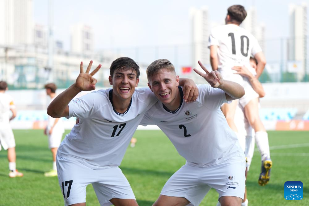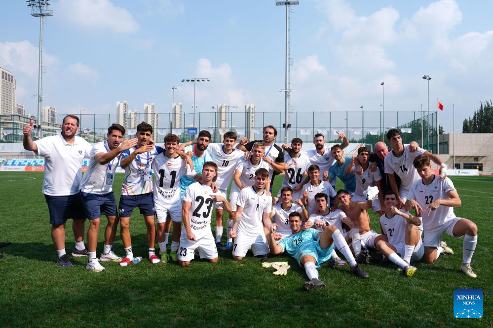 Members of University of Granada celebrate after the Men's Bronze Medal match between Chouaib Doukkali University (MAR) and University of Granada (ESP) of 2025 FISU University World Cup Football in Dalian, northeast China's Liaoning Province, on Sept. 28, 2025. (Xinhua/Zheng Huansong)