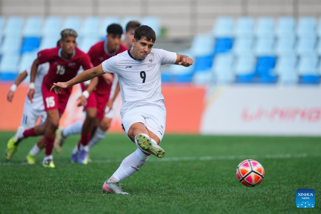 Cristian Lopez Montes (front) of University of Granada scores a penalty the Men's Bronze Medal match between Chouaib Doukkali University (MAR) and University of Granada (ESP) of 2025 FISU University World Cup Football in Dalian, northeast China's Liaoning Province, on Sept. 28, 2025. (Xinhua/Zheng Huansong)
