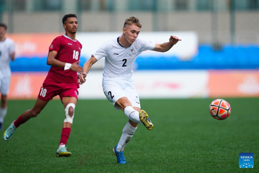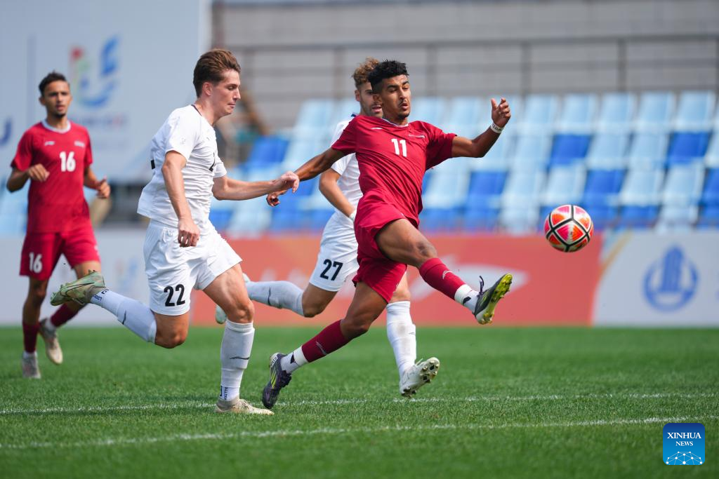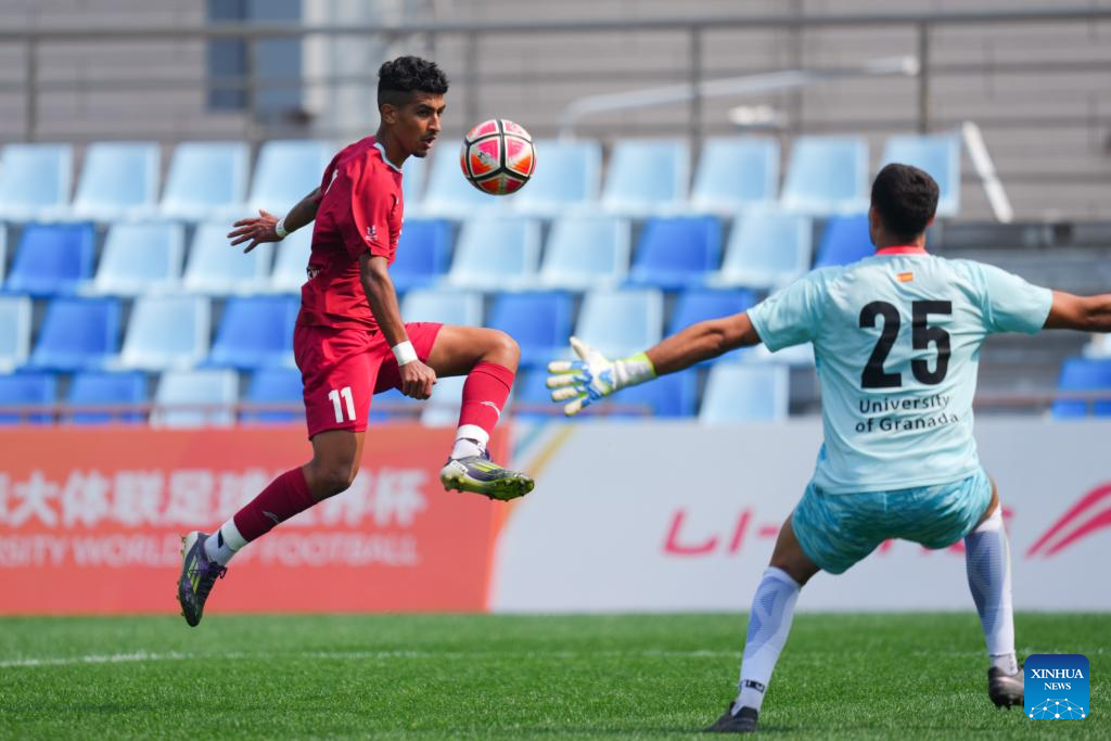 Oussama El Karouaoui (1st R) of Chouaib Doukkali University scores during the Men's Bronze Medal match between Chouaib Doukkali University (MAR) and University of Granada (ESP) of 2025 FISU University World Cup Football in Dalian, northeast China's Liaoning Province, on Sept. 28, 2025. (Xinhua/Zheng Huansong)