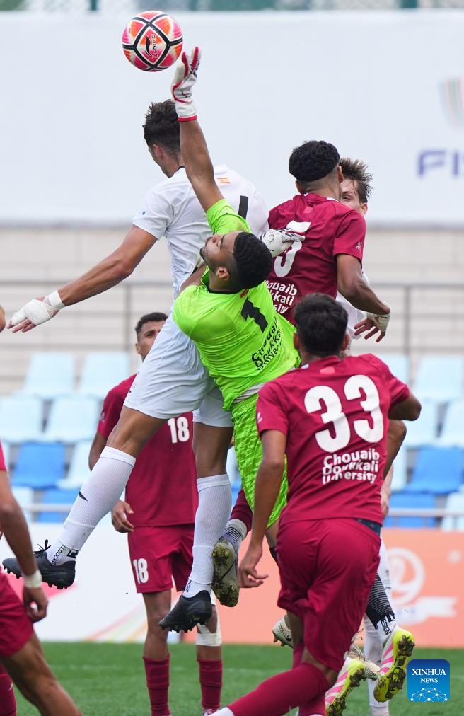 Mohammed-Nabil Mouddakir (top R), goalkeeper of Chouaib Doukkali University, makes a save during the Men's Bronze Medal match between Chouaib Doukkali University (MAR) and University of Granada (ESP) of 2025 FISU University World Cup Football in Dalian, northeast China's Liaoning Province, on Sept. 28, 2025. (Xinhua/Zheng Huansong)