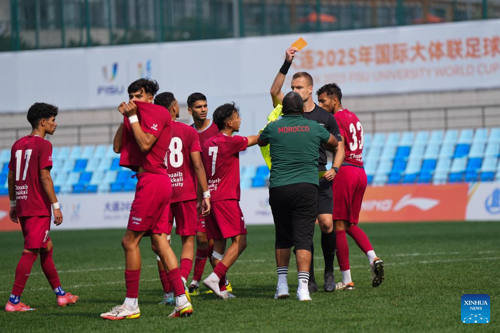 Referee Karel Roucek (2nd R) shows a red card to Othman Bih (3rd R), coach of Chouaib Doukkali University, during the Men's Bronze Medal match between Chouaib Doukkali University (MAR) and University of Granada (ESP) of 2025 FISU University World Cup Football in Dalian, northeast China's Liaoning Province, on Sept. 28, 2025. (Xinhua/Zheng Huansong)