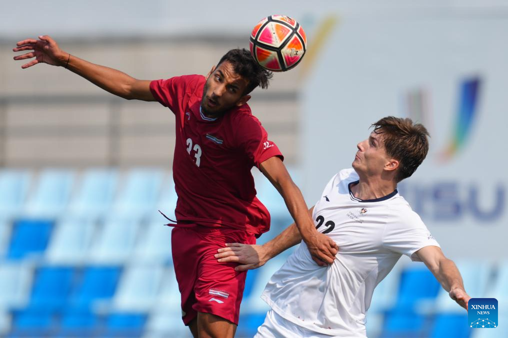 Ayoub Mahid (L) of Chouaib Doukkali University vies with Ignacio Antequera Sanchez of University of Granada during the Men's Bronze Medal match between Chouaib Doukkali University (MAR) and University of Granada (ESP) of 2025 FISU University World Cup Football in Dalian, northeast China's Liaoning Province, on Sept. 28, 2025. (Xinhua/Zheng Huansong)