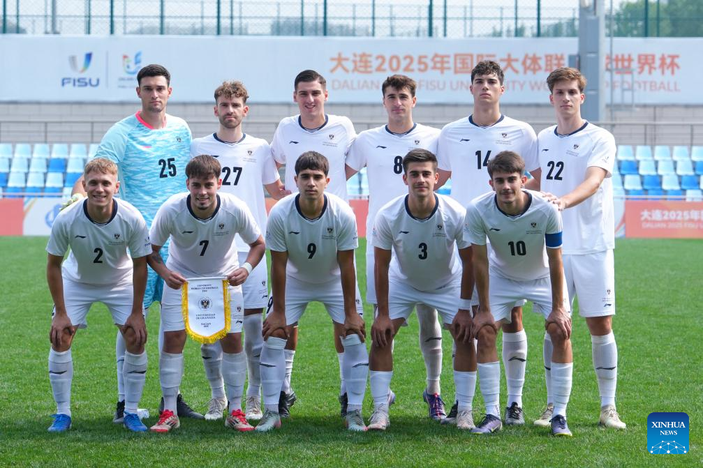 Players of University of Granada pose for photo prior to the Men's Bronze Medal match between Chouaib Doukkali University (MAR) and University of Granada (ESP) of 2025 FISU University World Cup Football in Dalian, northeast China's Liaoning Province, on Sept. 28, 2025. (Xinhua/Zheng Huansong)
