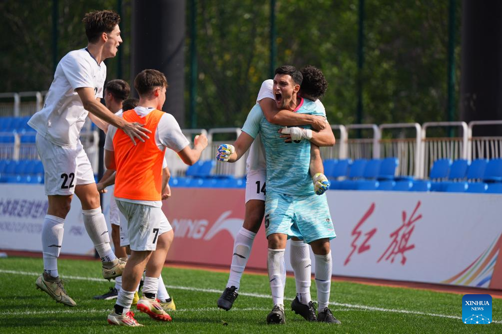 Francisco Fernando Caballero Santiago (R, front), goalkeeper of University of Granada, celebrates after the penalty shootout of the Men's Bronze Medal match between Chouaib Doukkali University (MAR) and University of Granada (ESP) of 2025 FISU University World Cup Football in Dalian, northeast China's Liaoning Province, on Sept. 28, 2025. (Xinhua/Zheng Huansong)