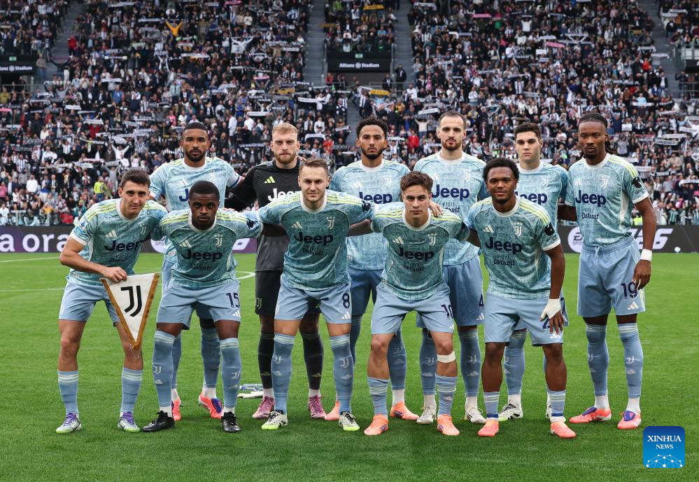 Players of Juventus pose for a group photo before a Serie A football match between Juventus and Atalanta in Turin, Italy, Sept. 27, 2025. (Xinhua/Li Jing)