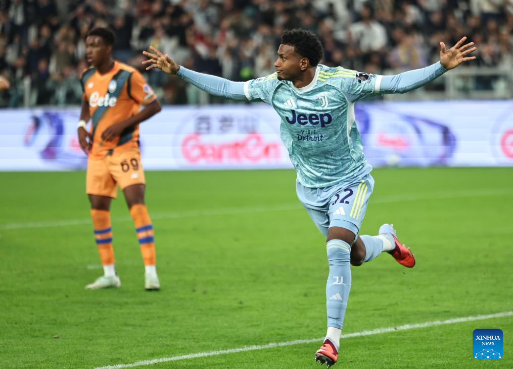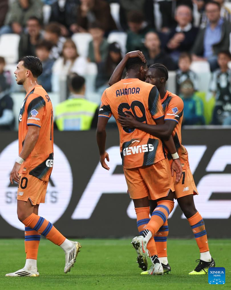 Atalanta's Kamaldeen Sulemana (R) celebrates after scoring during a Serie A football match between Juventus and Atalanta in Turin, Italy, Sept. 27, 2025. (Xinhua/Li Jing)