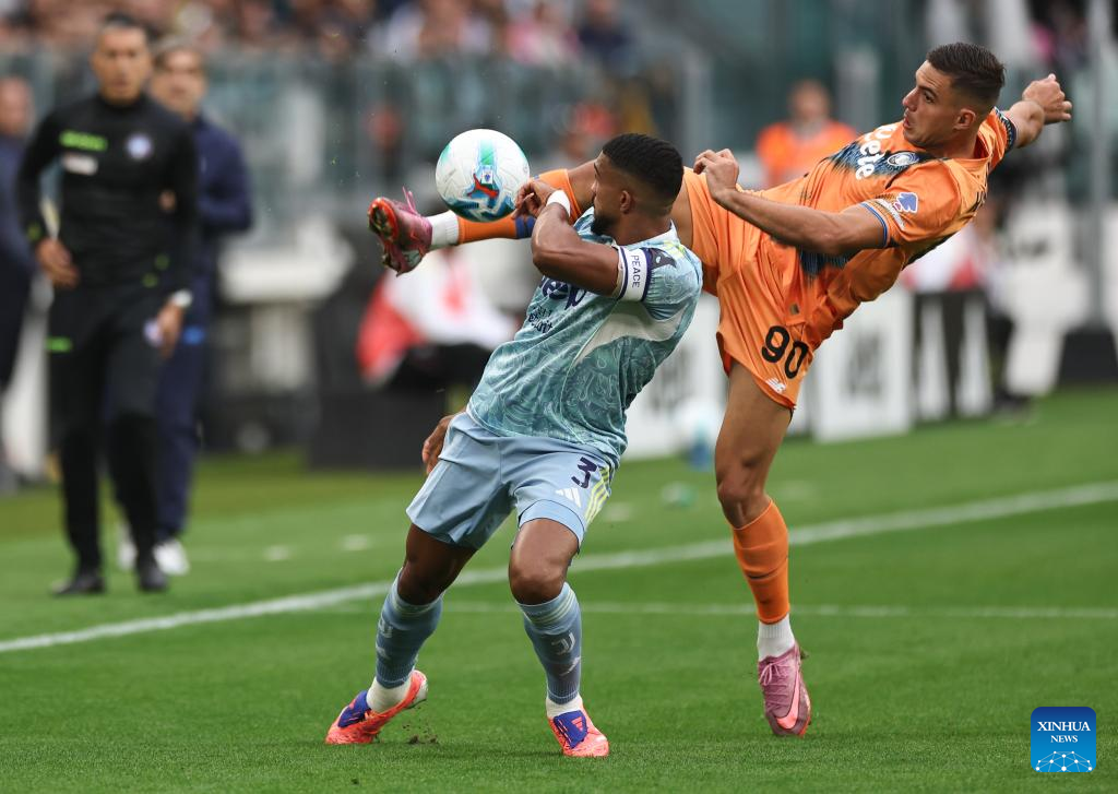 Atalanta's Mario Pasalic (R) vies with Juventus' Pierre Kalulu (C) during a Serie A football match between Juventus and Atalanta in Turin, Italy, Sept. 27, 2025. (Xinhua/Li Jing)