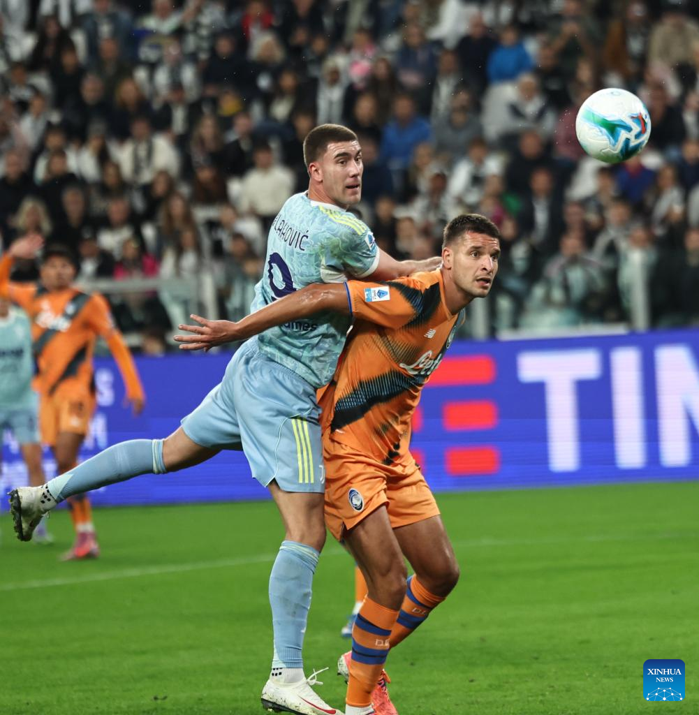 Atalanta's Berat Djimsiti (R) vies with Juventus' Dusan Vlahovic during a Serie A football match between Juventus and Atalanta in Turin, Italy, Sept. 27, 2025. (Xinhua/Li Jing)