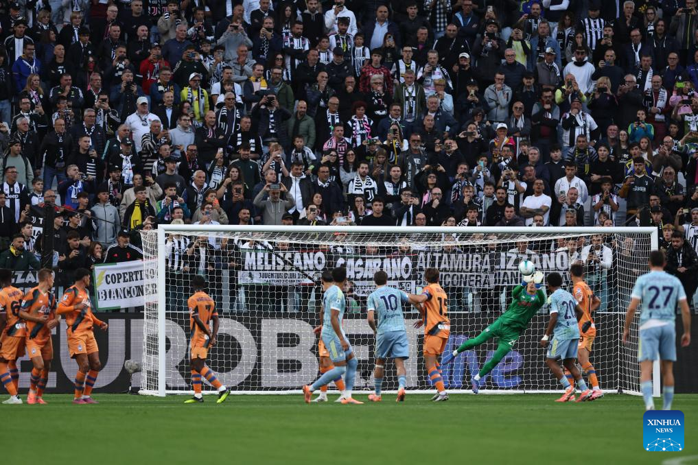 Atalanta's goalkeeper Marco Carnesecchi (top) makes a save during a Serie A football match between Juventus and Atalanta in Turin, Italy, Sept. 27, 2025. (Xinhua/Li Jing)