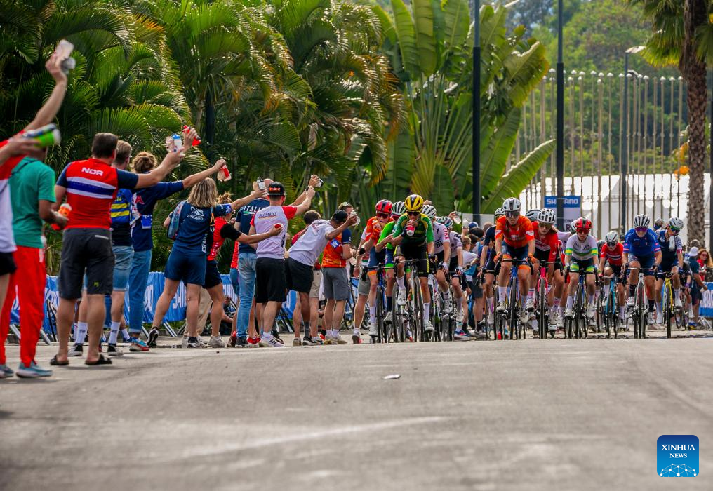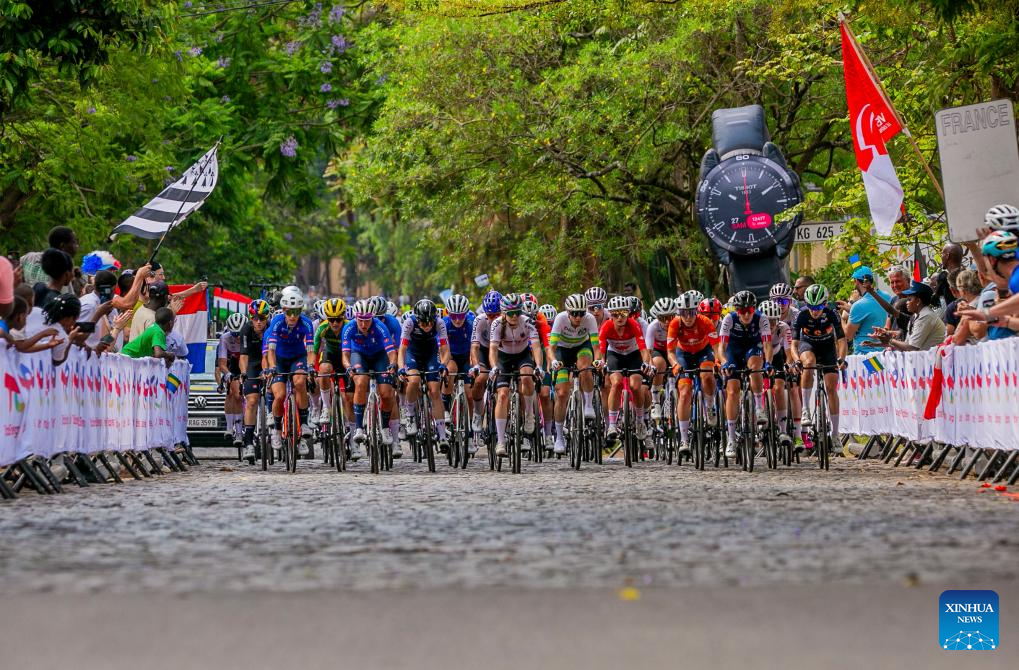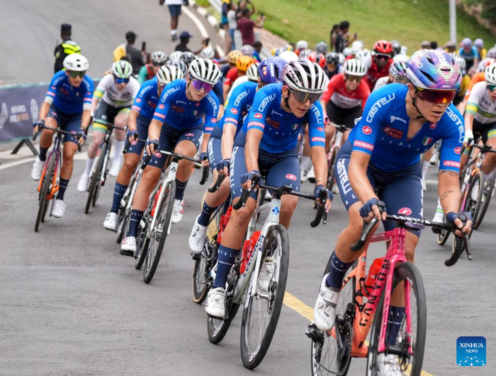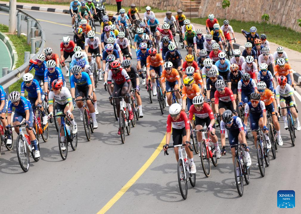 Cyclists compete during the women's elite road race at the 2025 UCI Road World Championships in Kigali, Rwanda, on Sept. 27, 2025. (Xinhua/Li Yahui)