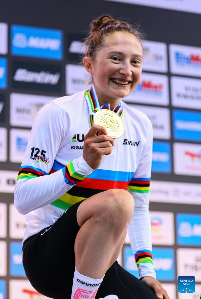 Gold medalist Magdeleine Vallieres Mill of Canada poses during the awarding ceremony for the women's elite road race at the 2025 UCI Road World Championships in Kigali, Rwanda, on Sept. 27, 2025. (Photo by Huang Wanqing/Xinhua)