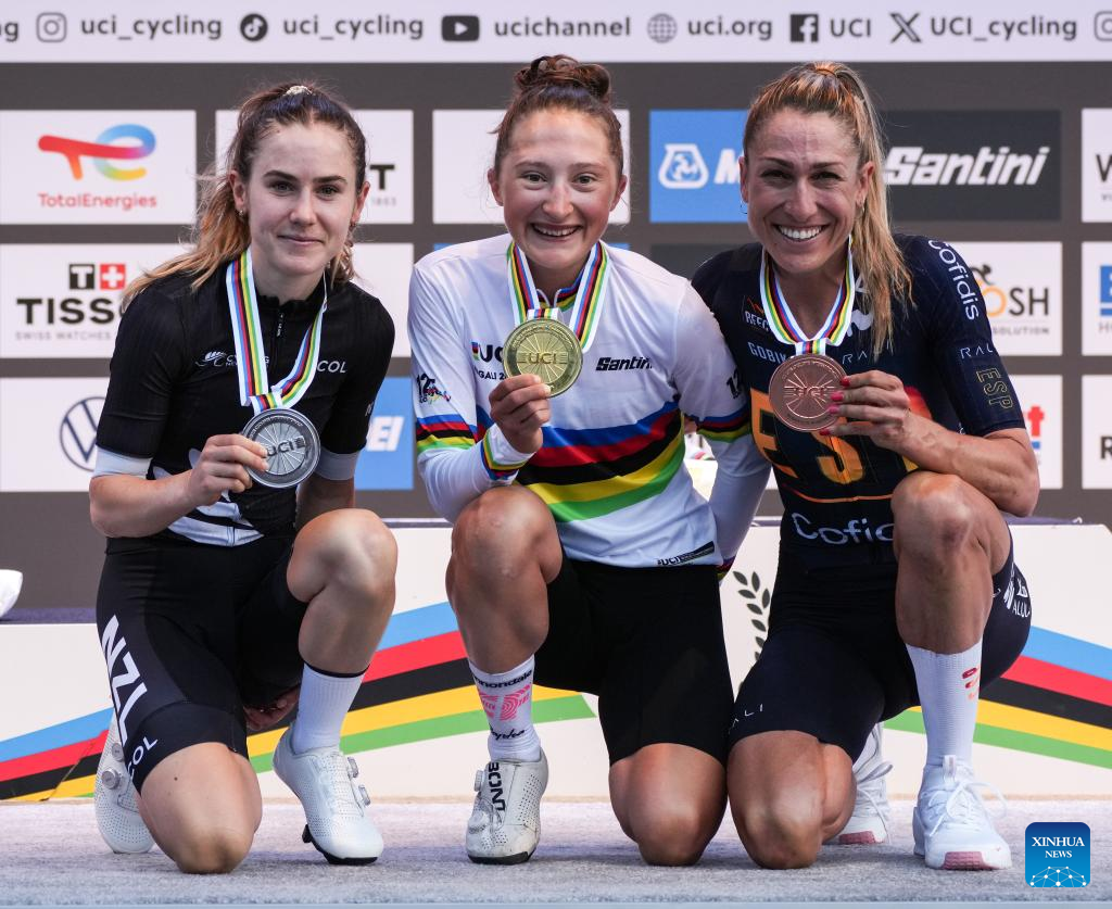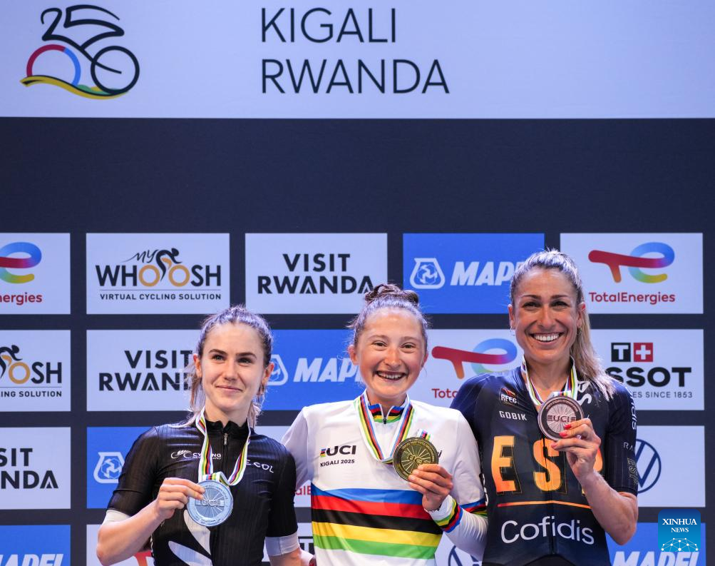 Gold medalist Magdeleine Vallieres Mill (C) of Canada, silver medalist Niamh Fisher-Black (L) of New Zealand and Margarita Victo Garcia Canellas of Spain pose during the awarding ceremony for the women's elite road race at the 2025 UCI Road World Championships in Kigali, Rwanda, on Sept. 27, 2025. (Xinhua/Li Yahui)