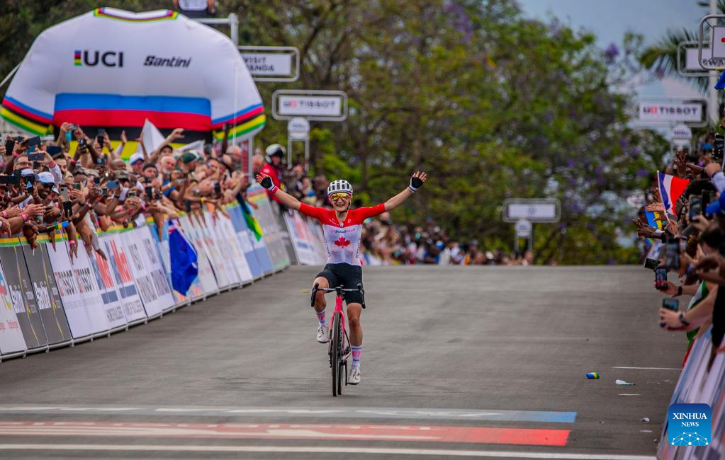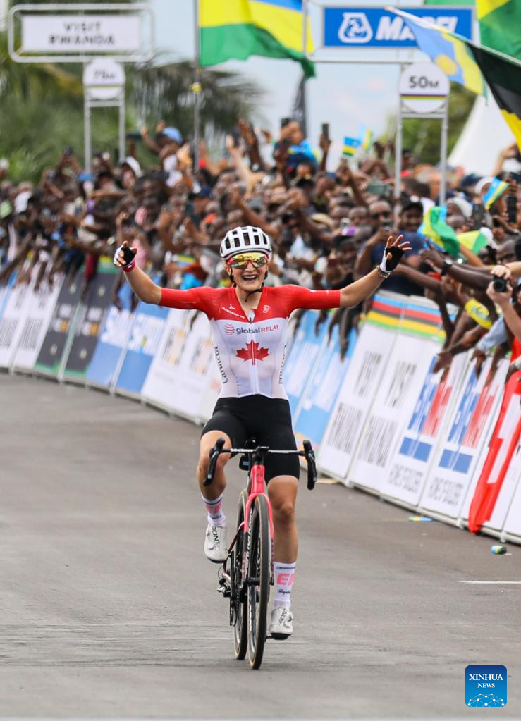Magdeleine Vallieres Mill of Canada celebrates after finishing the women's elite road race at the 2025 UCI Road World Championships in Kigali, Rwanda, on Sept. 27, 2025. (Photo by Cyril Ndegeya/Xinhua)