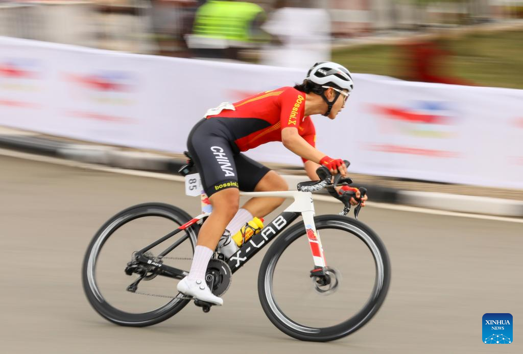 Zhang Hao of China competes during the women's elite road race at the 2025 UCI Road World Championships in Kigali, Rwanda, on Sept. 27, 2025. (Photo by Huang Wanqing/Xinhua)