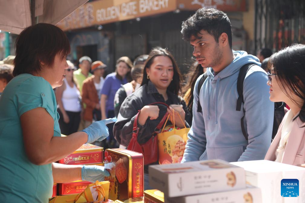 People buy moon cakes at the Autumn Moon Festival in San Francisco, the United States, Sept. 27, 2025. The two-day event kicked off here on Saturday. (Photo by Liu Yilin/Xinhua)