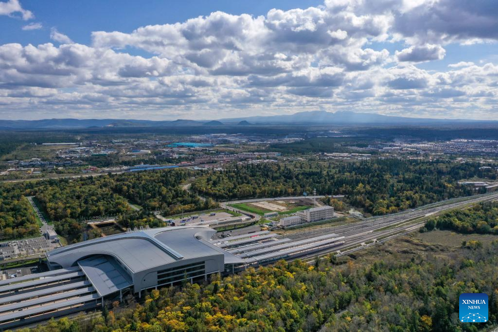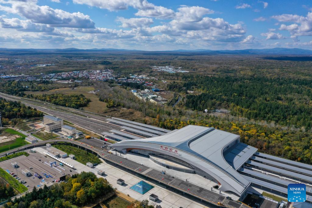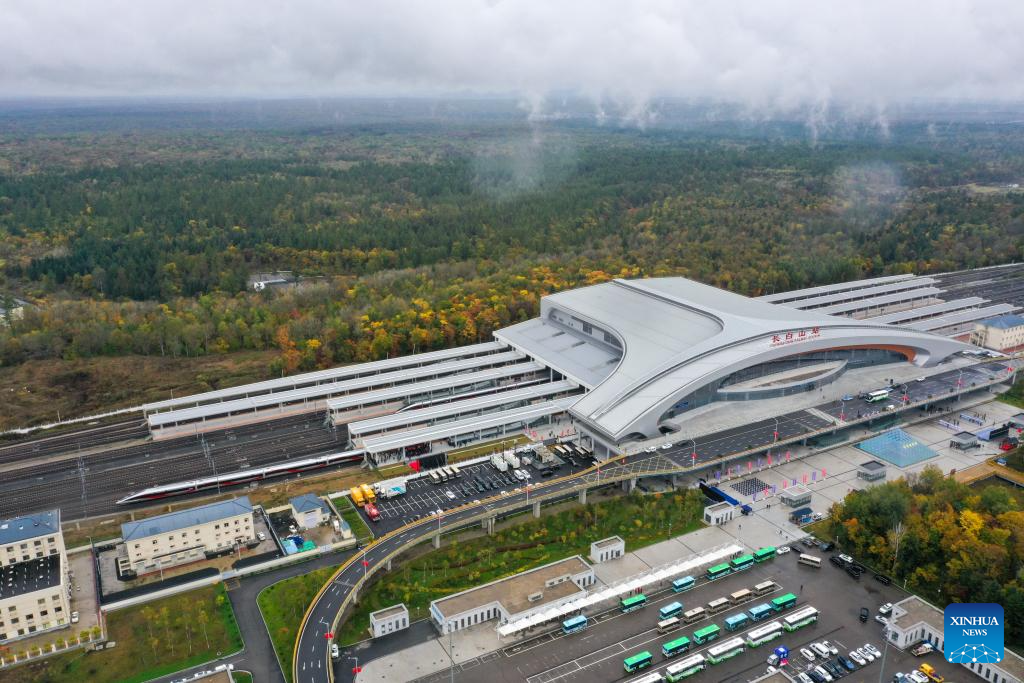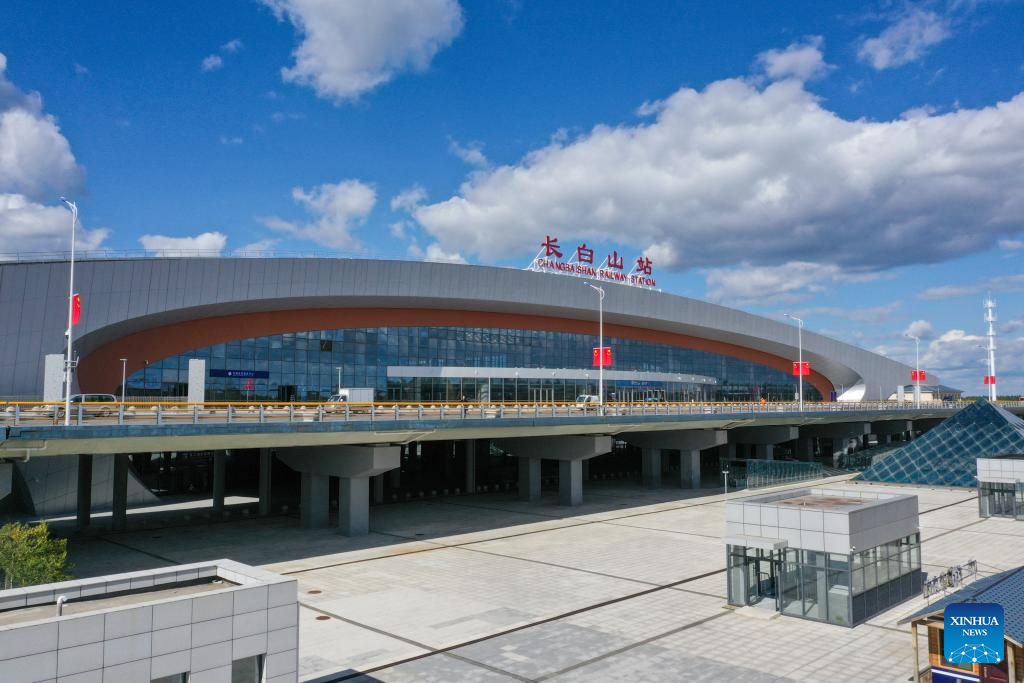 An aerial drone photo taken on Sept. 26, 2025 shows Changbaishan Railway Station on the Shenyang-Baihe section of the Shenyang-Jiamusi High-Speed Railway in Yanbian Korean Autonomous Prefecture of northeast China's Jilin Province. A new high-speed rail link began operation on Sunday, significantly shortening the travel time from China's capital Beijing to the renowned Changbai Mountain in the northeastern province of Jilin, offering a boost to China's growing winter sports and ice tourism market.