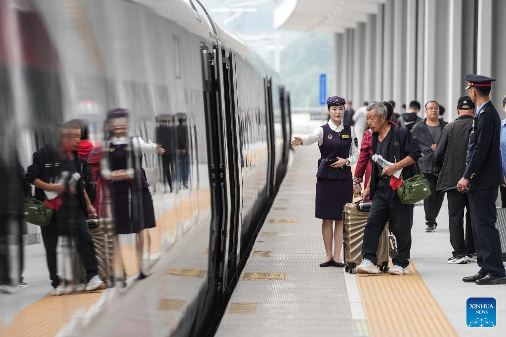 Passengers walk to board a train of the Shenyang-Baihe section of the Shenyang-Jiamusi High-Speed Railway at Changbaishan Railway Station in Yanbian Korean Autonomous Prefecture of northeast China's Jilin Province, Sept. 28, 2025. A new high-speed rail link began operation on Sunday, significantly shortening the travel time from China's capital Beijing to the renowned Changbai Mountain in the northeastern province of Jilin, offering a boost to China's growing winter sports and ice tourism market.