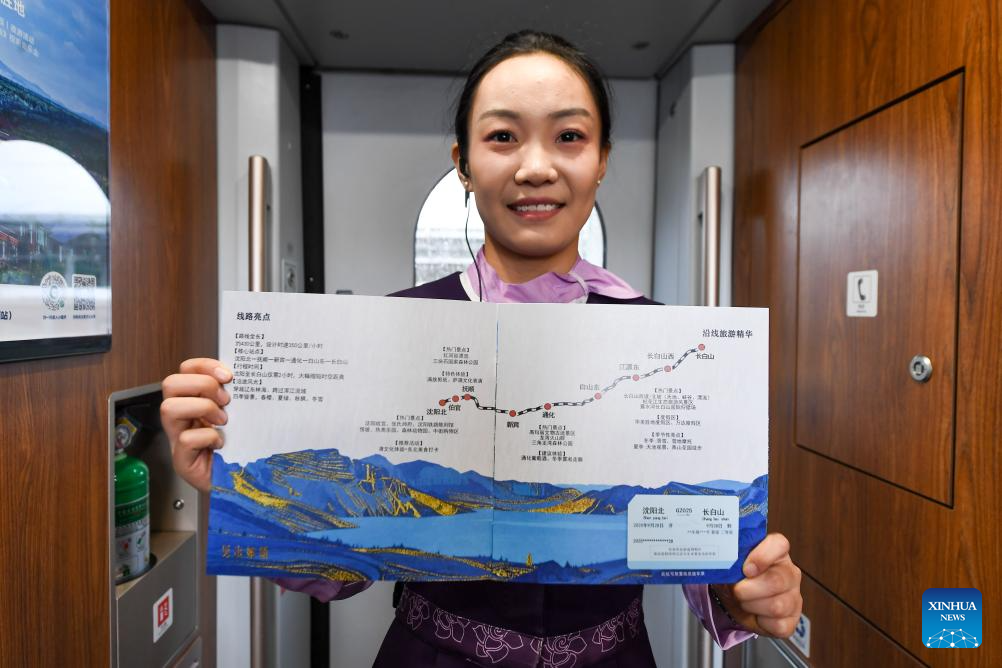 A stewardess shows a commemorative album of Shenyang-Baihe section of the Shenyang-Jiamusi High-Speed Railway on the train G8166 on Sept. 28, 2025. A new high-speed rail link began operation on Sunday, significantly shortening the travel time from China's capital Beijing to the renowned Changbai Mountain in the northeastern province of Jilin, offering a boost to China's growing winter sports and ice tourism market.