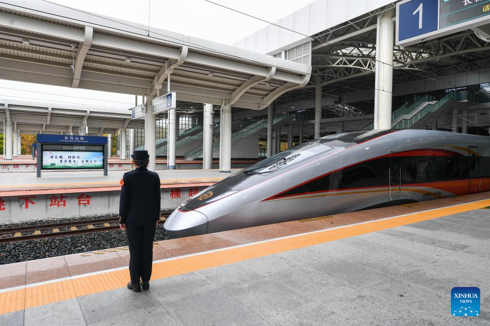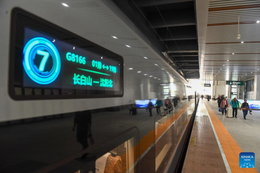 This photo taken on Sept. 28, 2025 shows a train of the Shenyang-Baihe section of the Shenyang-Jiamusi High-Speed Railway at Changbaishan Railway Station in Yanbian Korean Autonomous Prefecture of northeast China's Jilin Province. A new high-speed rail link began operation on Sunday, significantly shortening the travel time from China's capital Beijing to the renowned Changbai Mountain in the northeastern province of Jilin, offering a boost to China's growing winter sports and ice tourism market.
