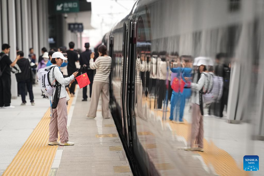 Passengers walk to board a train of the Shenyang-Baihe section of the Shenyang-Jiamusi High-Speed Railway at Fushun Railway Station in Fushun, northeast China's Liaoning Province, Sept. 28, 2025. A new high-speed rail link began operation on Sunday, significantly shortening the travel time from China's capital Beijing to the renowned Changbai Mountain in the northeastern province of Jilin, offering a boost to China's growing winter sports and ice tourism market.
