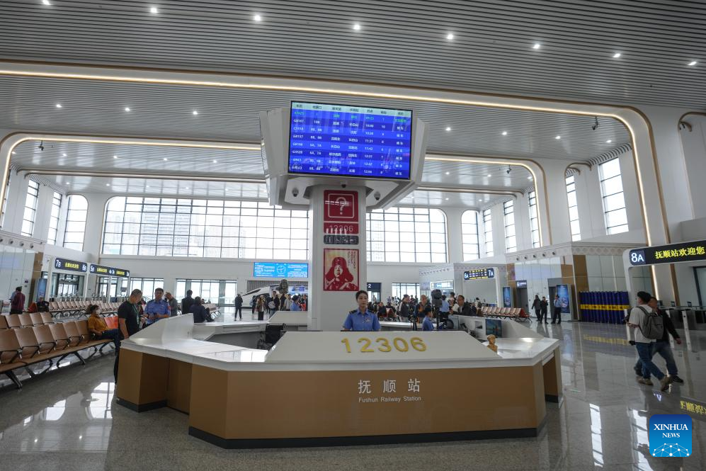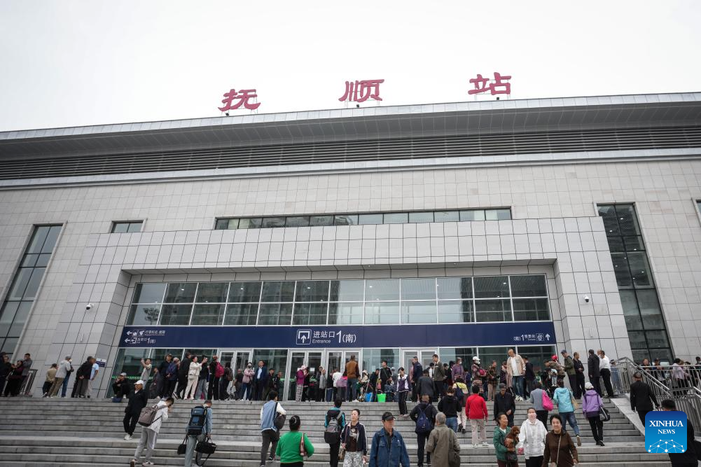 This photo taken on Sept. 28, 2025 shows an entrance of Fushun Railway Station in Fushun, northeast China's Liaoning Province. A new high-speed rail link began operation on Sunday, significantly shortening the travel time from China's capital Beijing to the renowned Changbai Mountain in the northeastern province of Jilin, offering a boost to China's growing winter sports and ice tourism market.