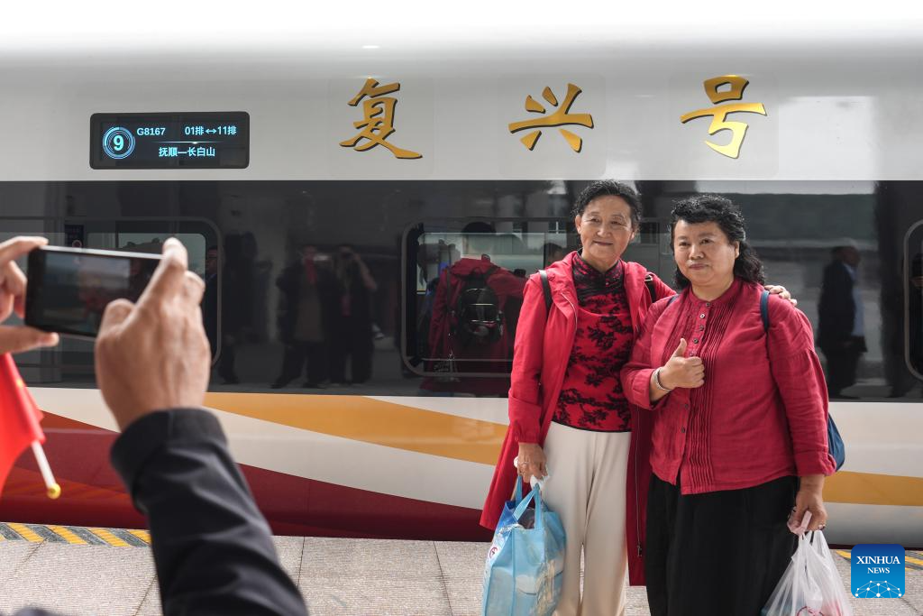 Passengers pose for photos at Fushun Railway Station in Fushun, northeast China's Liaoning Province, Sept. 28, 2025. A new high-speed rail link began operation on Sunday, significantly shortening the travel time from China's capital Beijing to the renowned Changbai Mountain in the northeastern province of Jilin, offering a boost to China's growing winter sports and ice tourism market.