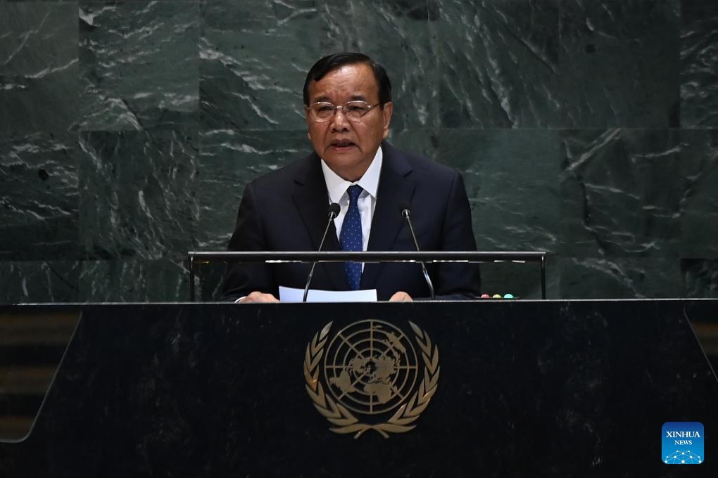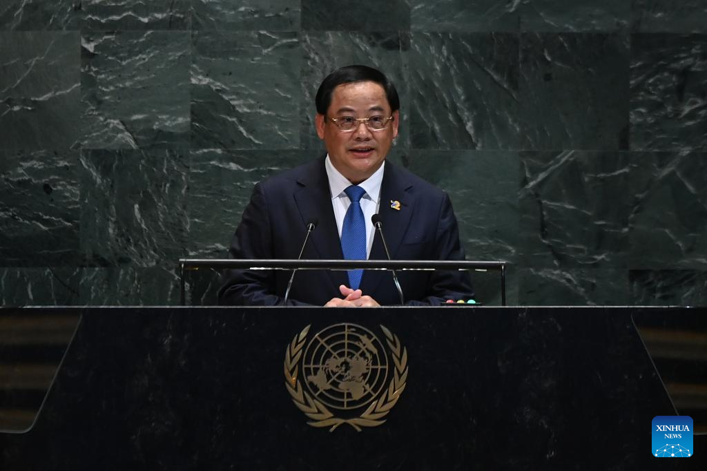 Lao Prime Minister Sonexay Siphandone delivers a speech during the General Debate of the 80th session of the United Nations General Assembly (UNGA) at the UN headquarters in New York on Sept. 27, 2025. (Xinhua/Li Rui)