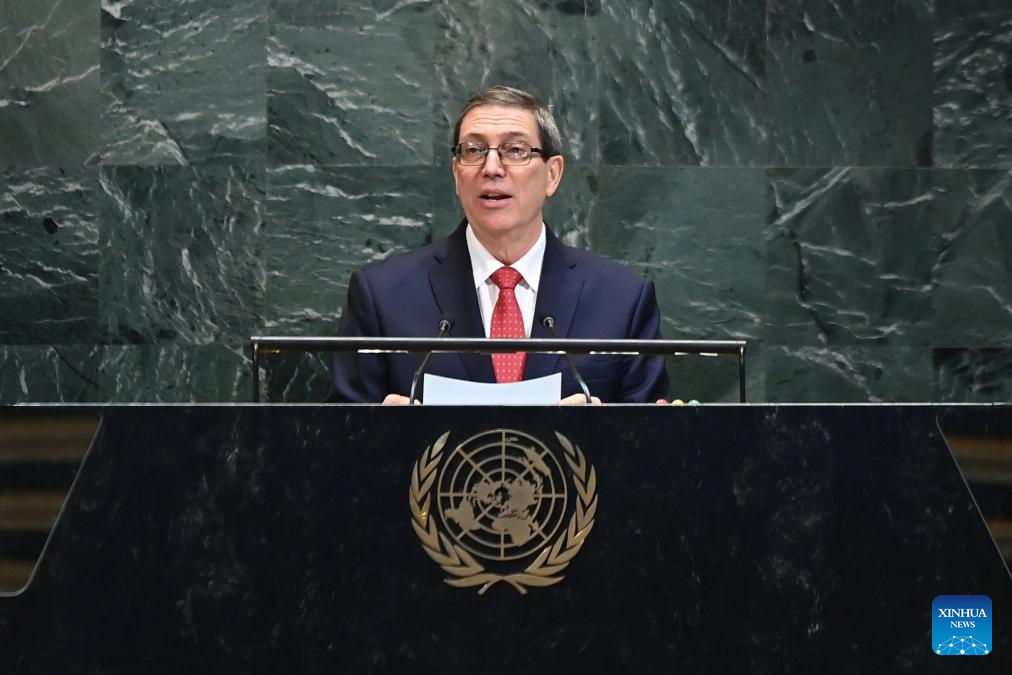 Cuban Foreign Minister Bruno Rodriguez Parrilla delivers a speech during the General Debate of the 80th session of the United Nations General Assembly (UNGA) at the UN headquarters in New York on Sept. 27, 2025. (Xinhua/Li Rui)