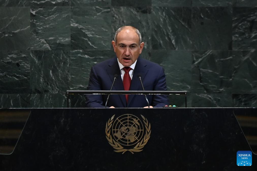 Armenian Prime Minister Nikol Pashinyan delivers a speech during the General Debate of the 80th session of the United Nations General Assembly (UNGA) at the UN headquarters in New York on Sept. 27, 2025. (Xinhua/Li Rui)