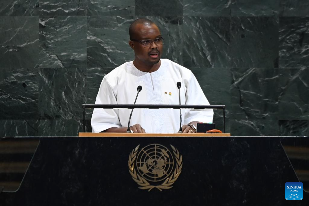 Burkina Faso's Prime Minister Rimtalba Jean Emmanuel Ouedraogo delivers a speech during the General Debate of the 80th session of the United Nations General Assembly (UNGA) at the UN headquarters in New York on Sept. 27, 2025. (Xinhua/Li Rui)
