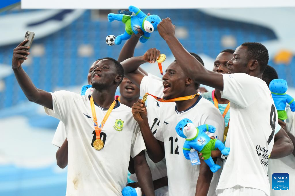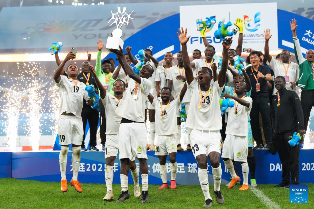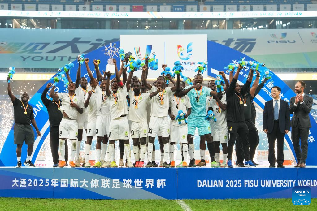 Players of University for Development Studies celebrate during the awarding ceremony after the men's final match between Paulista University (Brazil) and University for Development Studies (Ghana) of 2025 FISU University World Cup Football in Dalian, northeast China's Liaoning Province, Sept. 28, 2025. (Xinhua/Zheng Huansong)