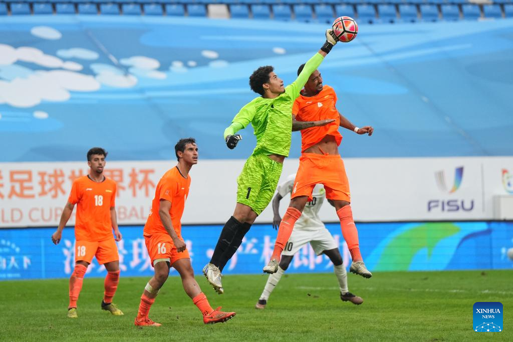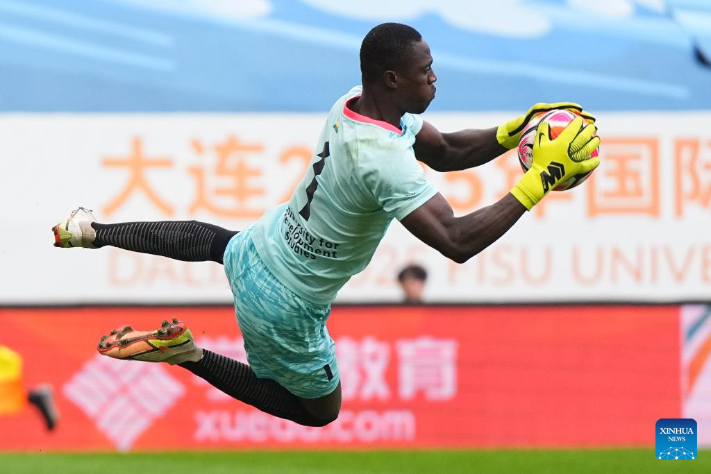 Emmanuel Edo, goalkeeper of University for Development Studies, saves the ball during the men's final match between Paulista University (Brazil) and University for Development Studies (Ghana) of 2025 FISU University World Cup Football in Dalian, northeast China's Liaoning Province, Sept. 28, 2025. (Xinhua/Zheng Huansong)