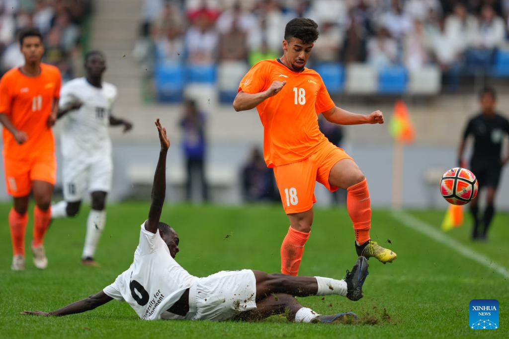 Leonardo Pinheiro Goncalves (R) of Paulista University vies with Ibrahim Mohammed of University for Development Studies during the men's final match between Paulista University (Brazil) and University for Development Studies (Ghana) of 2025 FISU University World Cup Football in Dalian, northeast China's Liaoning Province, Sept. 28, 2025. (Xinhua/Zheng Huansong)