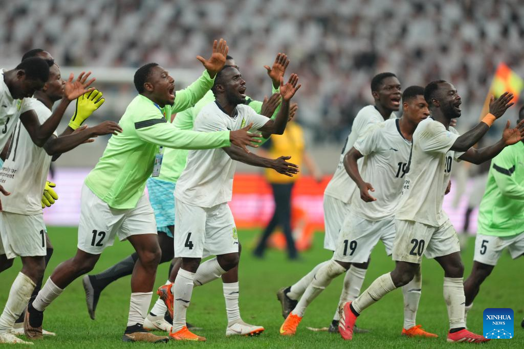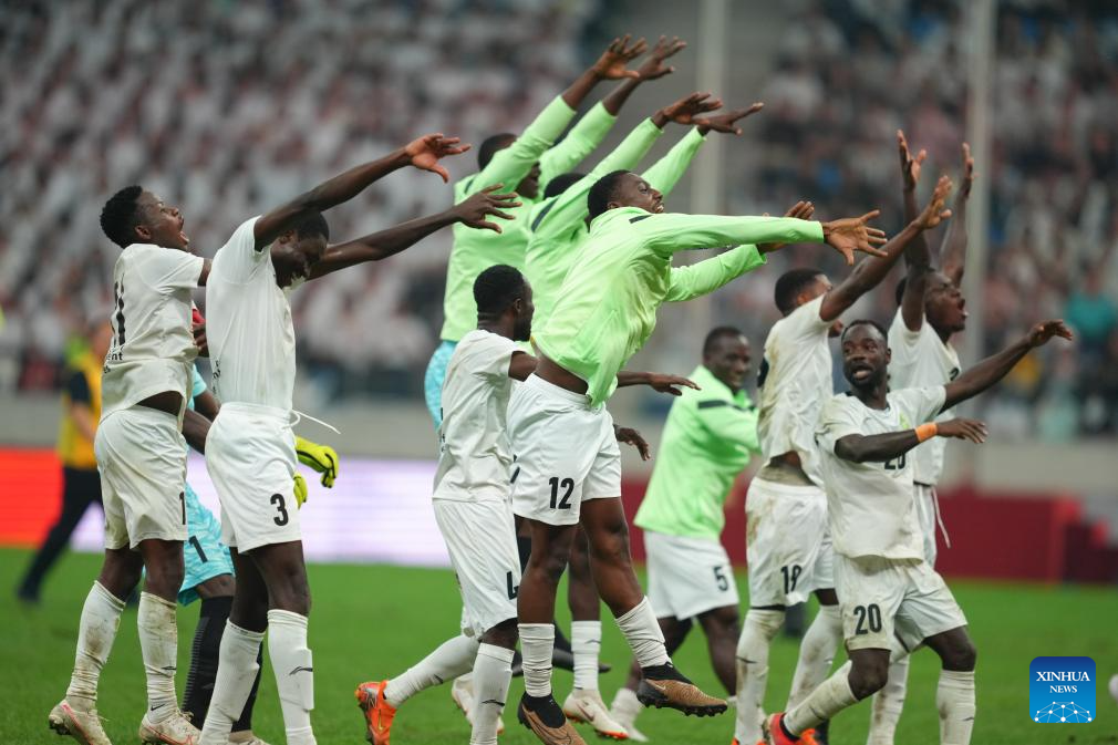 Players of University for Development Studies celebrate during the men's final match between Paulista University (Brazil) and University for Development Studies (Ghana) of 2025 FISU University World Cup Football in Dalian, northeast China's Liaoning Province, Sept. 28, 2025. (Xinhua/Zheng Huansong)