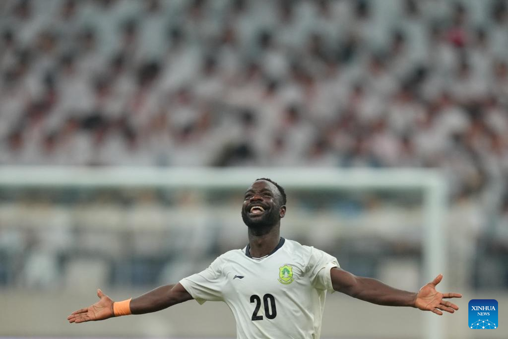 Mohammed Asigre Sulemana (front) of University for Development Studies celebrates his goal during the men's final match between Paulista University (Brazil) and University for Development Studies (Ghana) of 2025 FISU University World Cup Football in Dalian, northeast China's Liaoning Province, Sept. 28, 2025. (Xinhua/Zheng Huansong)